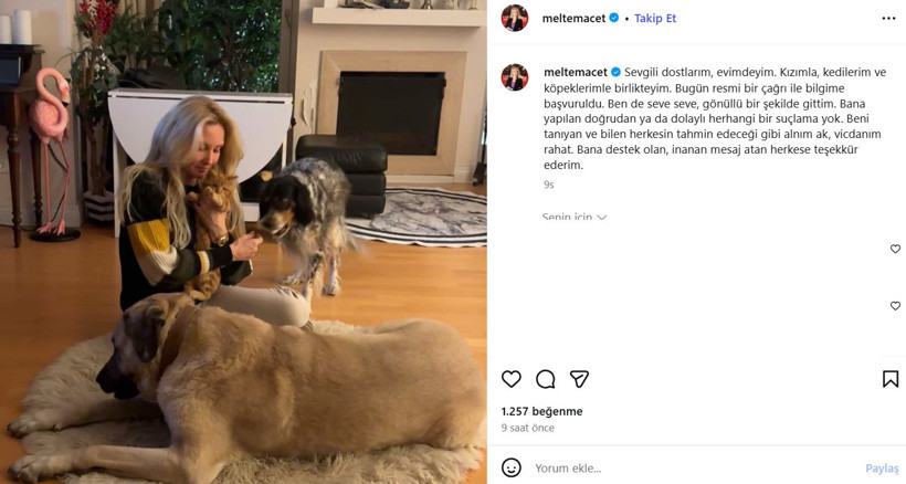Meltem Acet sosyal medya hesabından yaptığı açıklamada şunları söyledi: “Sevgili dostlarım, evimdeyim. Kızımla, kedilerim ve köpeklerimle birlikteyim. Bugün resmi bir çağrı ile bilgime başvuruldu. Ben de seve seve, gönüllü bir şekilde gittim. Bana yapılan doğrudan ya da dolaylı herhangi bir suçlama yok. Beni tanıyan ve bilen herkesin tahmin edeceği gibi alnım ak, vicdanım rahat. Bana destek olan, inanan mesaj atan herkese teşekkür ederim.”